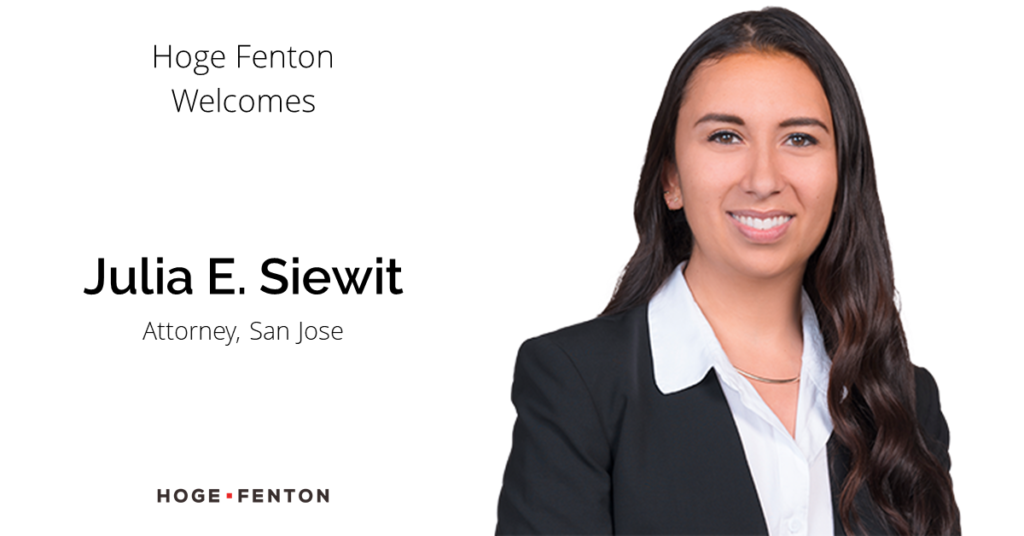 We’re delighted to welcome associate Julia E. Siewit to Hoge Fenton’s Corporate and Business Law Practice Group in our Silicon Valley office. Julia’s practice focuses on assisting clients with forming business entities, corporate governance, and assisting with mergers and acquisitions. She also specializes in corporate taxation by guiding clients to minimize tax liability.